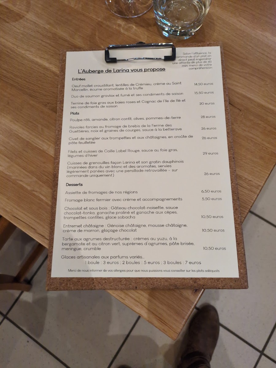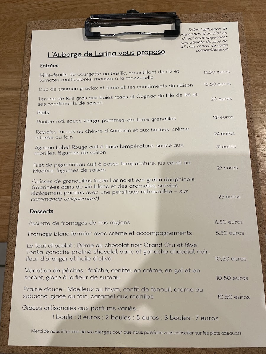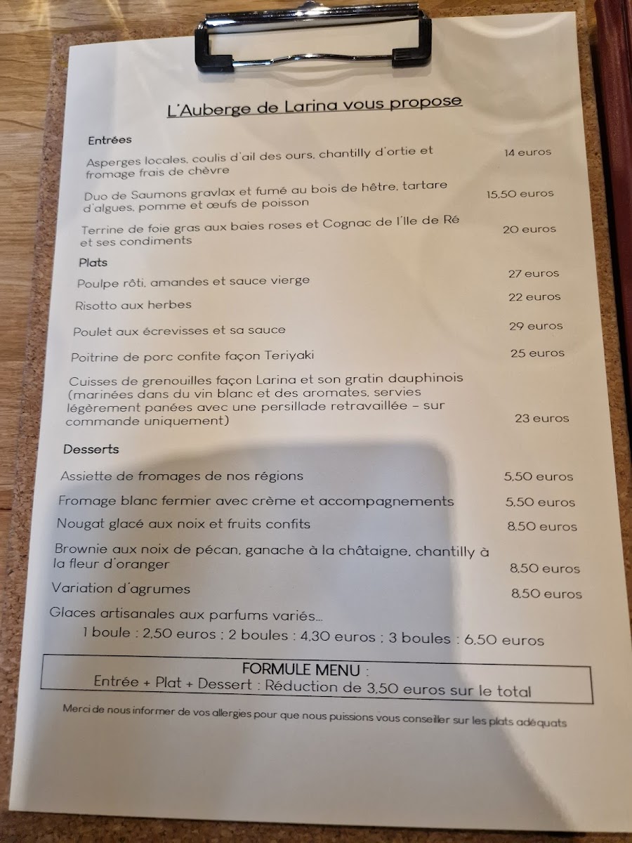 The menu at Auberge De Larina offers a rich and diverse selection of dishes, blending classic French cuisine with regional flavors. A standout dish is Les Grenouilles, which offers a unique and delicate flavor, perfect for those looking to explore French delicacies. For seafood lovers, Poulpe and Gravlax de Saumon are highly recommended, showcasing fresh and expertly prepared options from the sea.